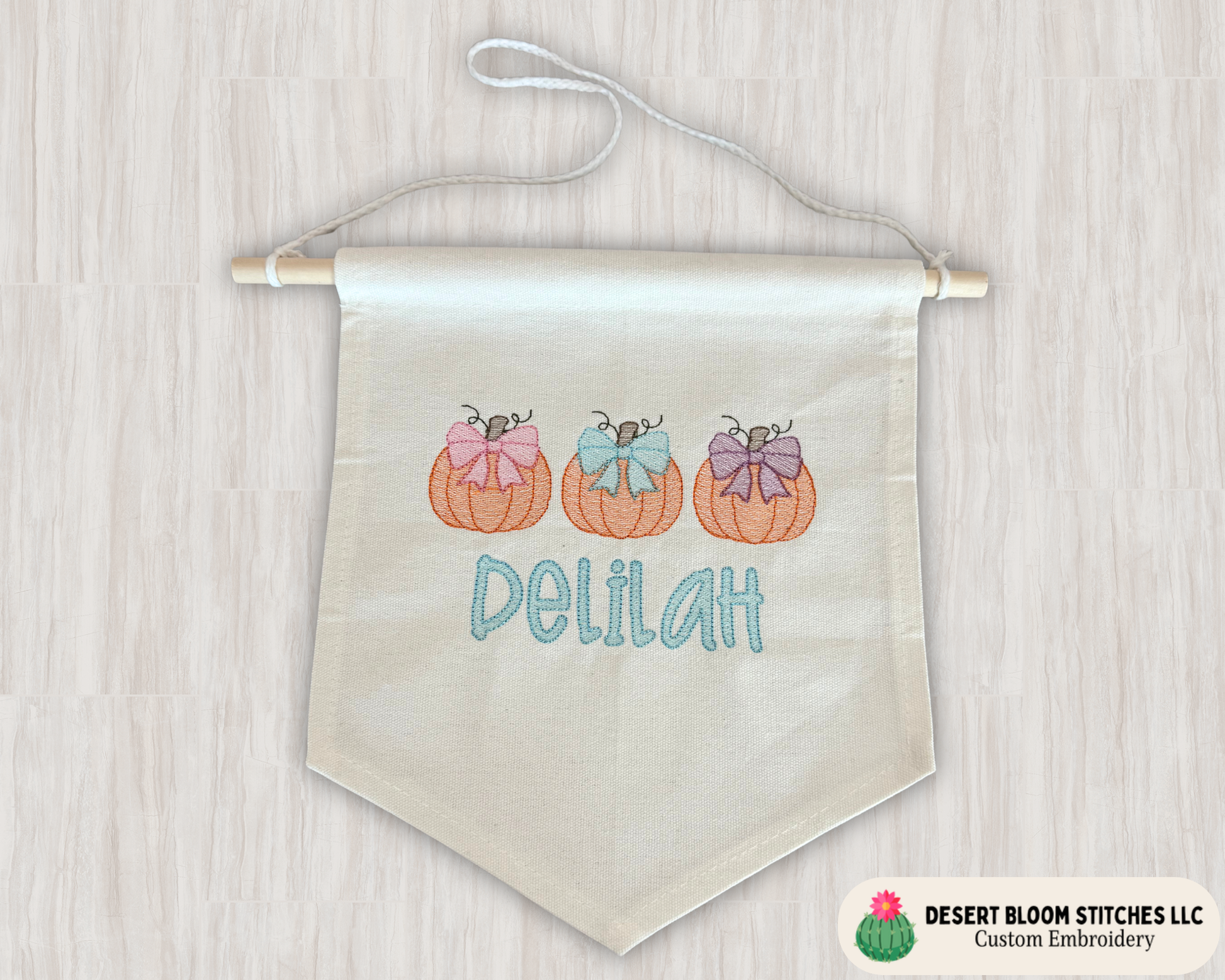 Welcome autumn with this cute banner, perfect for your little pumpkin's door! The banner is about 10" wide and 12" tall.